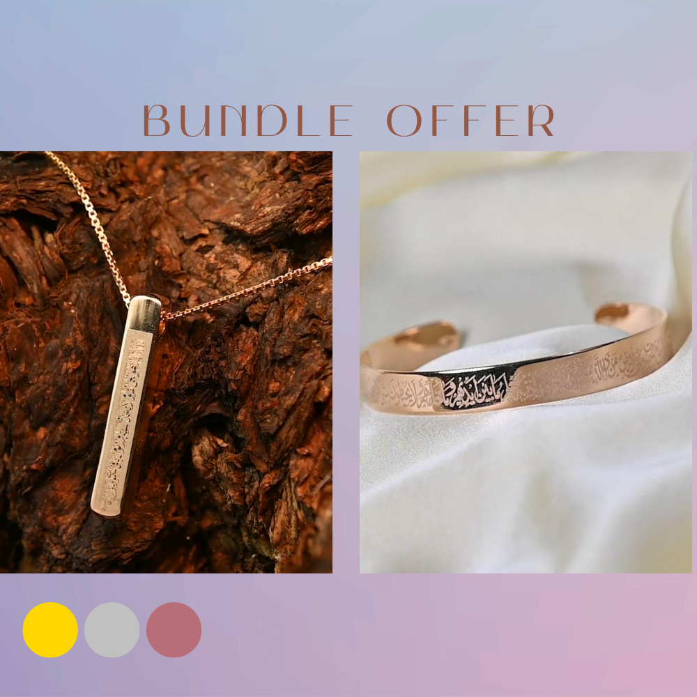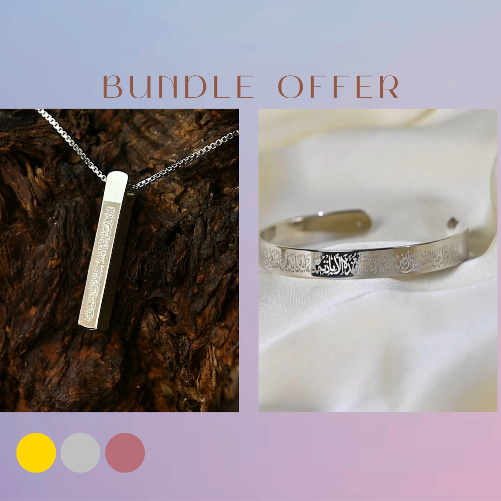 We're combining our two best-sellers and most intricate designs in this stunning bundle. The Ayatul Kursi 3d bar Necklace, alongside the beautifully unique Ayatul Kursi Cuff, now available in one bundle. Choose your color of choice, and buy know