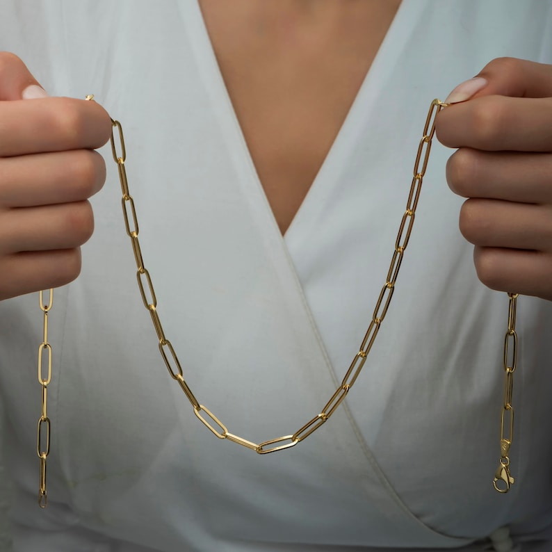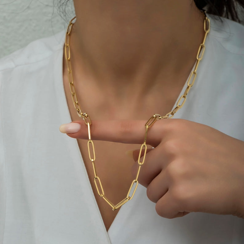 The Paperclip Chain Necklace for Women is a sleek and minimalist accessory that adds a touch of modern sophistication to any ensemble. Crafted from high-quality materials such as Stainless Steel, silver & gold plated, this necklace features interlocking paperclip-shaped links that create a chic and versatile design.