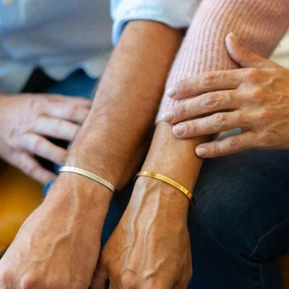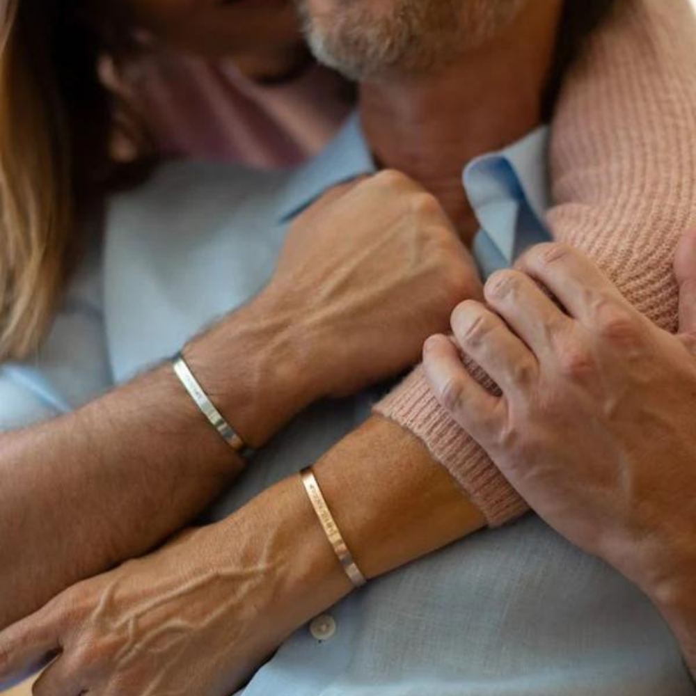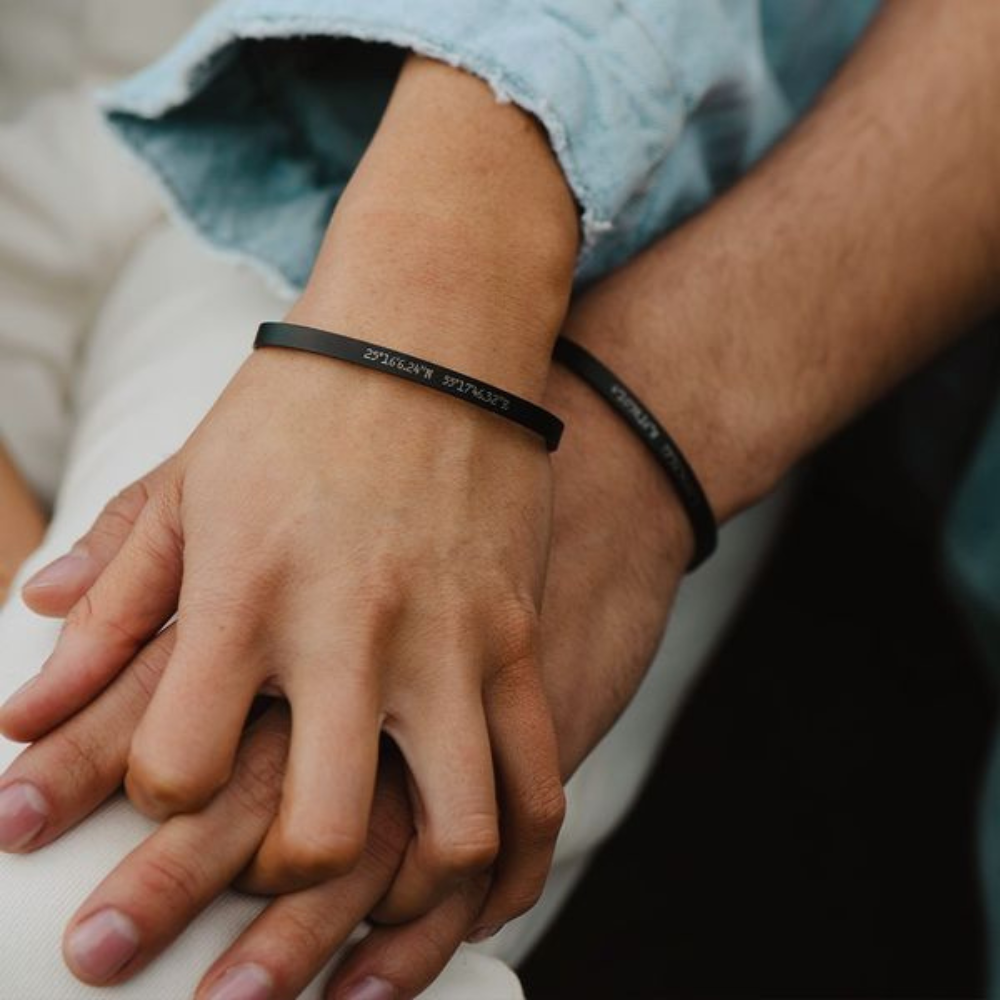 Our custom name couple bangles are fully adjustable with high quality material and we use stainless steel to make the bracelet skin friendly. You can customize any name coordinates or special message on the outside and inside of the product.
