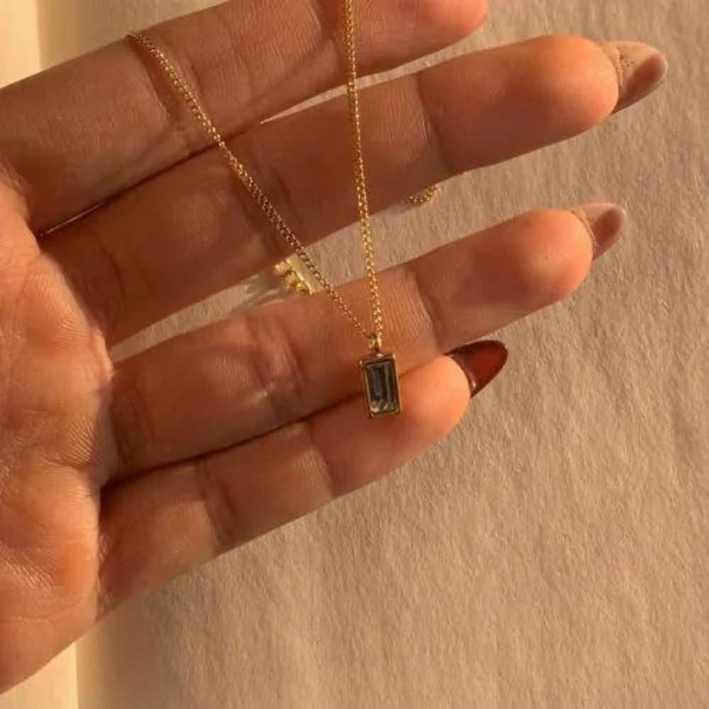 At its heart lies a radiant rectangular pendant adorned with a captivating solitaire stone, meticulously cut to emulate the brilliance of a genuine diamond. The pendant delicately hangs from a sleek and smooth chain, adding a touch of understated glamour to any ensemble.